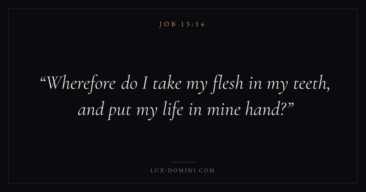 Books / Job / Chapter 13 / Verse 14 ← Job 13:13 Job 13:14 Job 13:15 → Wherefore do I take my flesh in my teeth, and put my life in mine hand? Download verse card Share on Twitter Share on Facebook Pin it ✦ Key themes HopeSuffering and trialsWisdomJustice and mercySuffering Read with Job 13:13Romans 8:24Revelation 21:4Romans 8:18 Related topics Bible verses about hopeBible verses about suffering and trialsBible verses about wisdomBible verses about justice and mercy ✦ Job Chapter 13 verses V. 1 V. 2 V. 3 V. 4 V. 5 V. 6 V. 7 V. 8 V. 9 V. 10 V. 11 V. 12 V. 13 V. 14 V. 15 V. 16 V. 17 V. 18 V. 19 V. 20 V. 21 V. 22 V. 23 V. 24 V. 25 V. 26 V. 27 V. 28