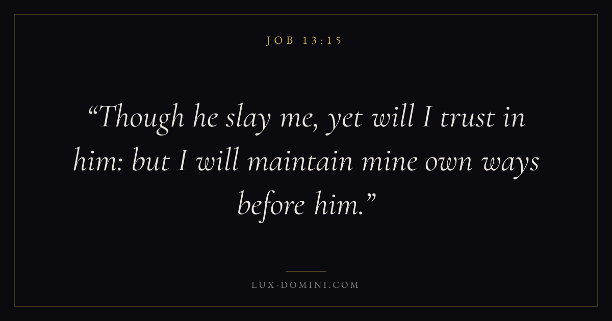Books / Job / Chapter 13 / Verse 15 ← Job 13:14 Job 13:15 Job 13:16 → Though he slay me, yet will I trust in him: but I will maintain mine own ways before him. Download verse card Share on Twitter Share on Facebook Pin it ✦ Key themes FaithHopeSuffering and trialsWisdomSuffering Read with Job 13:16Hebrews 11:1Romans 10:17Romans 8:24 Related topics Bible verses about faithBible verses about hopeBible verses about suffering and trialsBible verses about wisdom ✦ Job Chapter 13 verses V. 1 V. 2 V. 3 V. 4 V. 5 V. 6 V. 7 V. 8 V. 9 V. 10 V. 11 V. 12 V. 13 V. 14 V. 15 V. 16 V. 17 V. 18 V. 19 V. 20 V. 21 V. 22 V. 23 V. 24 V. 25 V. 26 V. 27 V. 28