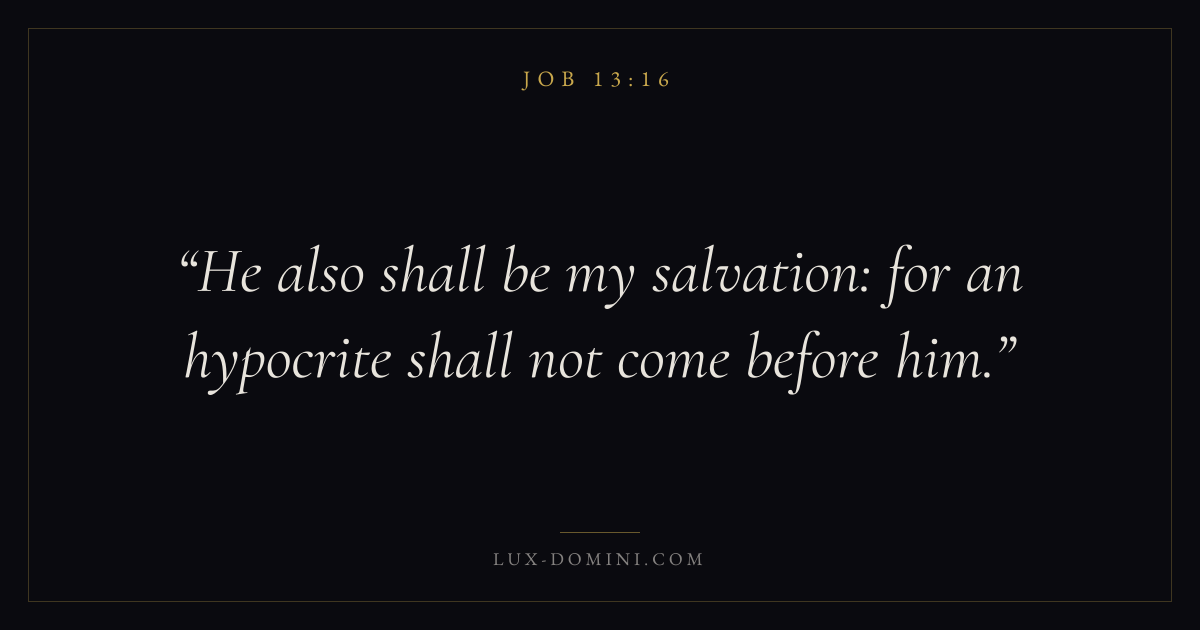 Books / Job / Chapter 13 / Verse 16 ← Job 13:15 Job 13:16 Job 13:17 → He also shall be my salvation: for an hypocrite shall not come before him. Download verse card Share on Twitter Share on Facebook Pin it ✦ Key themes HopeSuffering and trialsWisdomJustice and mercySuffering Read with Job 13:15Romans 8:24Revelation 21:4Romans 8:18 Related topics Bible verses about hopeBible verses about suffering and trialsBible verses about wisdomBible verses about justice and mercy ✦ Job Chapter 13 verses V. 1 V. 2 V. 3 V. 4 V. 5 V. 6 V. 7 V. 8 V. 9 V. 10 V. 11 V. 12 V. 13 V. 14 V. 15 V. 16 V. 17 V. 18 V. 19 V. 20 V. 21 V. 22 V. 23 V. 24 V. 25 V. 26 V. 27 V. 28