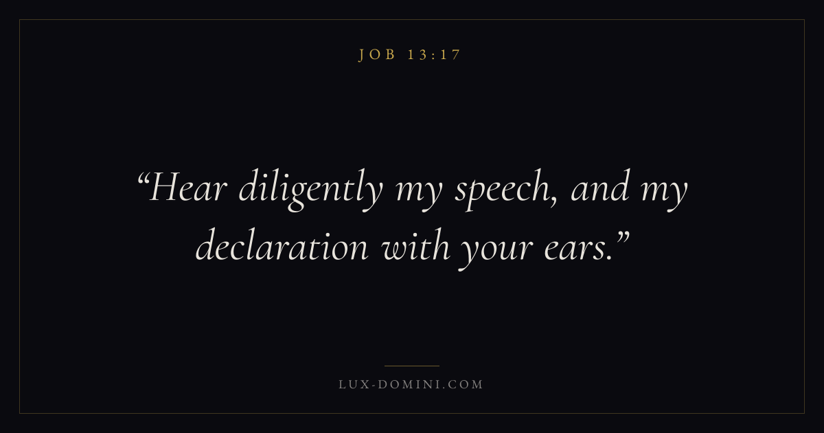 Books / Job / Chapter 13 / Verse 17 ← Job 13:16 Job 13:17 Job 13:18 → Hear diligently my speech, and my declaration with your ears. Download verse card Share on Twitter Share on Facebook Pin it ✦ Key themes HopeSuffering and trialsWisdomJustice and mercySuffering Read with Job 13:18Romans 8:24Revelation 21:4Romans 8:18 Related topics Bible verses about hopeBible verses about suffering and trialsBible verses about wisdomBible verses about justice and mercy ✦ Job Chapter 13 verses V. 1 V. 2 V. 3 V. 4 V. 5 V. 6 V. 7 V. 8 V. 9 V. 10 V. 11 V. 12 V. 13 V. 14 V. 15 V. 16 V. 17 V. 18 V. 19 V. 20 V. 21 V. 22 V. 23 V. 24 V. 25 V. 26 V. 27 V. 28