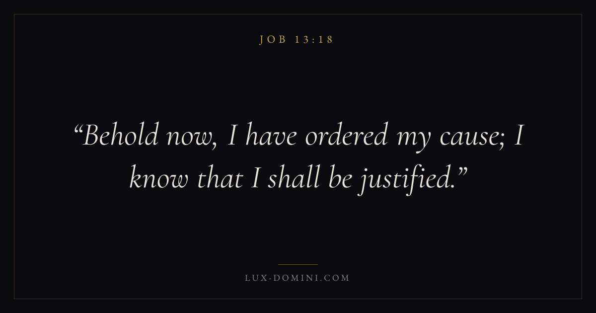 Books / Job / Chapter 13 / Verse 18 ← Job 13:17 Job 13:18 Job 13:19 → Behold now, I have ordered my cause; I know that I shall be justified. Download verse card Share on Twitter Share on Facebook Pin it ✦ Key themes HopeSuffering and trialsWisdomJustice and mercySuffering Read with Job 13:17Romans 8:24Revelation 21:4Romans 8:18 Related topics Bible verses about hopeBible verses about suffering and trialsBible verses about wisdomBible verses about justice and mercy ✦ Job Chapter 13 verses V. 1 V. 2 V. 3 V. 4 V. 5 V. 6 V. 7 V. 8 V. 9 V. 10 V. 11 V. 12 V. 13 V. 14 V. 15 V. 16 V. 17 V. 18 V. 19 V. 20 V. 21 V. 22 V. 23 V. 24 V. 25 V. 26 V. 27 V. 28