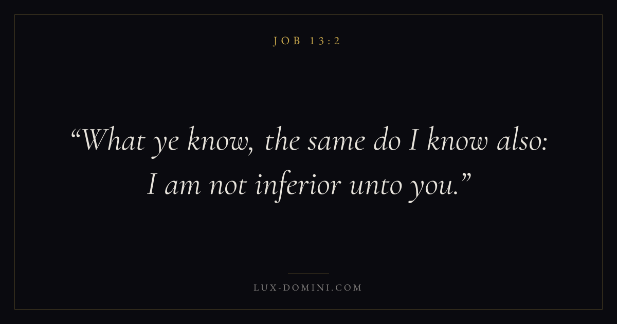 Books / Job / Chapter 13 / Verse 2 ← Job 13:1 Job 13:2 Job 13:3 → What ye know, the same do I know also: I am not inferior unto you. Download verse card Share on Twitter Share on Facebook Pin it ✦ Key themes Suffering and trialsWisdomJustice and mercySuffering Read with Job 13:1Romans 8:182 Corinthians 4:17Proverbs 1:7 Related topics Bible verses about suffering and trialsBible verses about wisdomBible verses about justice and mercy ✦ Job Chapter 13 verses V. 1 V. 2 V. 3 V. 4 V. 5 V. 6 V. 7 V. 8 V. 9 V. 10 V. 11 V. 12 V. 13 V. 14 V. 15 V. 16 V. 17 V. 18 V. 19 V. 20 V. 21 V. 22 V. 23 V. 24 V. 25 V. 26 V. 27 V. 28