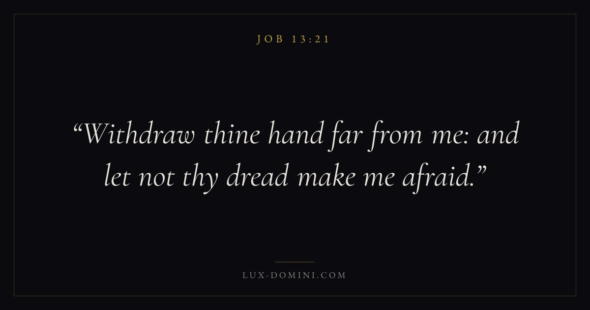 Books / Job / Chapter 13 / Verse 21 ← Job 13:20 Job 13:21 Job 13:22 → Withdraw thine hand far from me: and let not thy dread make me afraid. Download verse card Share on Twitter Share on Facebook Pin it ✦ Key themes HopeAnxiety and fearSuffering and trialsWisdomSuffering Read with Job 13:22Romans 8:24Revelation 21:4Philippians 4:6 Related topics Bible verses about hopeBible verses about anxiety and fearBible verses about suffering and trialsBible verses about wisdom ✦ Job Chapter 13 verses V. 1 V. 2 V. 3 V. 4 V. 5 V. 6 V. 7 V. 8 V. 9 V. 10 V. 11 V. 12 V. 13 V. 14 V. 15 V. 16 V. 17 V. 18 V. 19 V. 20 V. 21 V. 22 V. 23 V. 24 V. 25 V. 26 V. 27 V. 28