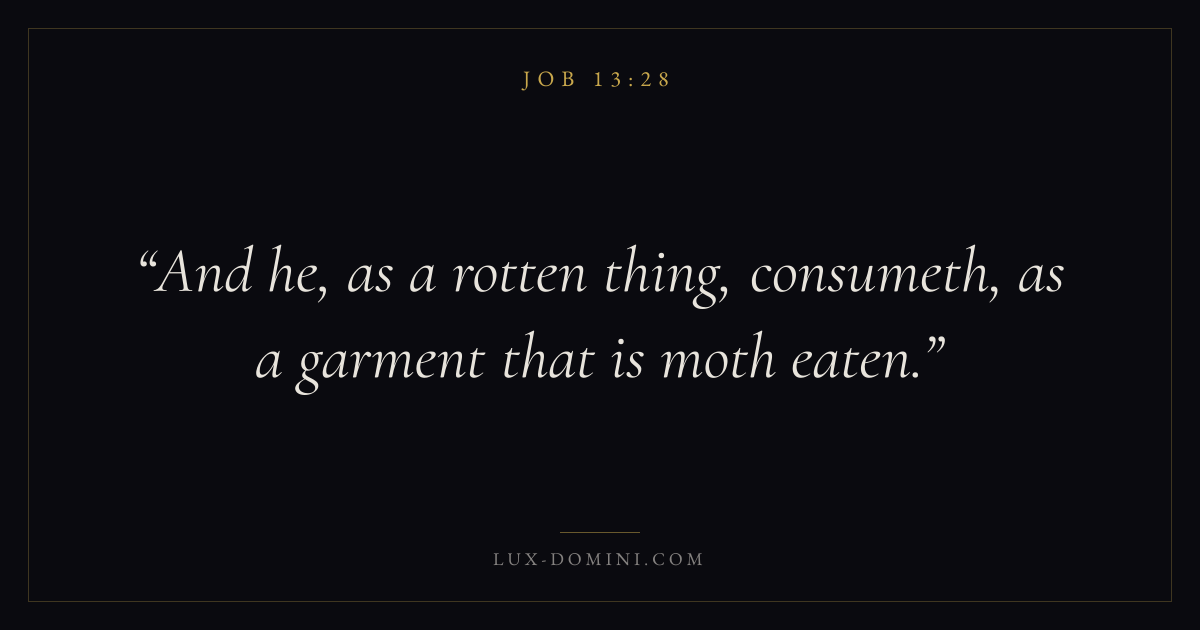 Books / Job / Chapter 13 / Verse 28 ← Job 13:27 Job 13:28 Job 14:1 → And he, as a rotten thing, consumeth, as a garment that is moth eaten. Download verse card Share on Twitter Share on Facebook Pin it ✦ Key themes Suffering and trialsWisdomJustice and mercyTruthSuffering Read with Job 13:27Romans 8:182 Corinthians 4:17Proverbs 1:7 Related topics Bible verses about suffering and trialsBible verses about wisdomBible verses about justice and mercyBible verses about truth ✦ Job Chapter 13 verses V. 1 V. 2 V. 3 V. 4 V. 5 V. 6 V. 7 V. 8 V. 9 V. 10 V. 11 V. 12 V. 13 V. 14 V. 15 V. 16 V. 17 V. 18 V. 19 V. 20 V. 21 V. 22 V. 23 V. 24 V. 25 V. 26 V. 27 V. 28