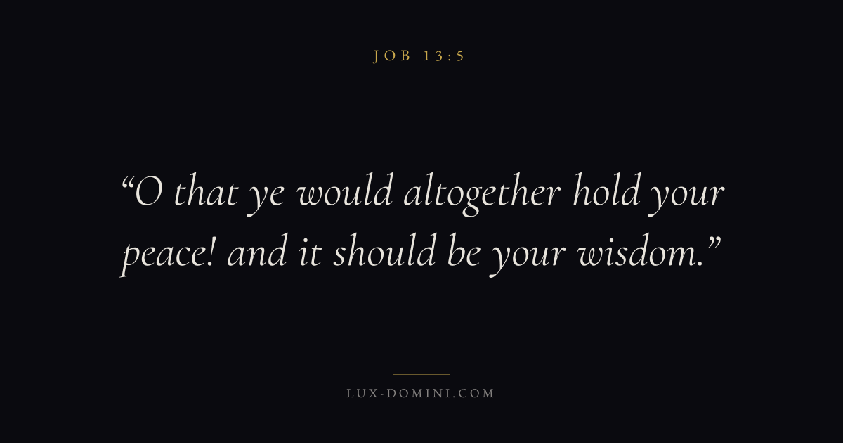 Books / Job / Chapter 13 / Verse 5 ← Job 13:4 Job 13:5 Job 13:6 → O that ye would altogether hold your peace! and it should be your wisdom. Download verse card Share on Twitter Share on Facebook Pin it ✦ Key themes Suffering and trialsWisdomJustice and mercyPeaceSuffering Read with Job 13:6Romans 8:182 Corinthians 4:17Proverbs 1:7 Related topics Bible verses about suffering and trialsBible verses about wisdomBible verses about justice and mercyBible verses about peace ✦ Job Chapter 13 verses V. 1 V. 2 V. 3 V. 4 V. 5 V. 6 V. 7 V. 8 V. 9 V. 10 V. 11 V. 12 V. 13 V. 14 V. 15 V. 16 V. 17 V. 18 V. 19 V. 20 V. 21 V. 22 V. 23 V. 24 V. 25 V. 26 V. 27 V. 28