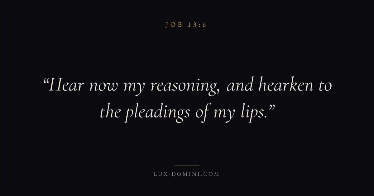Books / Job / Chapter 13 / Verse 6 ← Job 13:5 Job 13:6 Job 13:7 → Hear now my reasoning, and hearken to the pleadings of my lips. Download verse card Share on Twitter Share on Facebook Pin it ✦ Key themes Suffering and trialsWisdomJustice and mercySuffering Read with Job 13:5Romans 8:182 Corinthians 4:17Proverbs 1:7 Related topics Bible verses about suffering and trialsBible verses about wisdomBible verses about justice and mercy ✦ Job Chapter 13 verses V. 1 V. 2 V. 3 V. 4 V. 5 V. 6 V. 7 V. 8 V. 9 V. 10 V. 11 V. 12 V. 13 V. 14 V. 15 V. 16 V. 17 V. 18 V. 19 V. 20 V. 21 V. 22 V. 23 V. 24 V. 25 V. 26 V. 27 V. 28