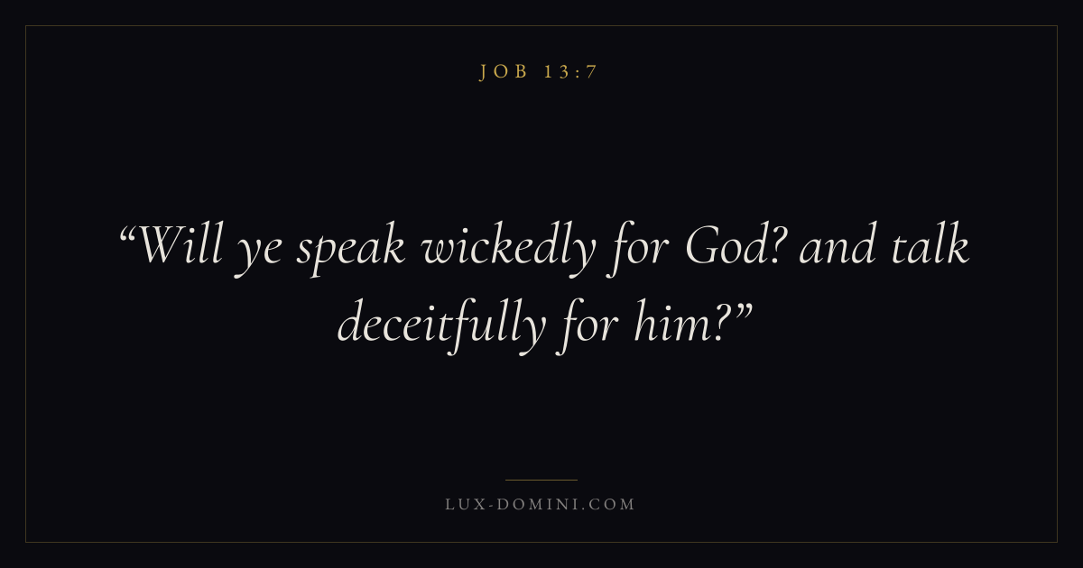 Books / Job / Chapter 13 / Verse 7 ← Job 13:6 Job 13:7 Job 13:8 → Will ye speak wickedly for God? and talk deceitfully for him? Download verse card Share on Twitter Share on Facebook Pin it ✦ Key themes Suffering and trialsWisdomJustice and mercySuffering Read with Job 13:8Romans 8:182 Corinthians 4:17Proverbs 1:7 Related topics Bible verses about suffering and trialsBible verses about wisdomBible verses about justice and mercy ✦ Job Chapter 13 verses V. 1 V. 2 V. 3 V. 4 V. 5 V. 6 V. 7 V. 8 V. 9 V. 10 V. 11 V. 12 V. 13 V. 14 V. 15 V. 16 V. 17 V. 18 V. 19 V. 20 V. 21 V. 22 V. 23 V. 24 V. 25 V. 26 V. 27 V. 28