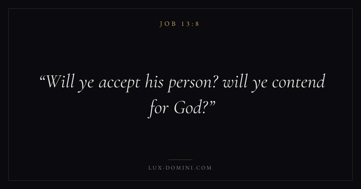 Books / Job / Chapter 13 / Verse 8 ← Job 13:7 Job 13:8 Job 13:9 → Will ye accept his person? will ye contend for God? Download verse card Share on Twitter Share on Facebook Pin it ✦ Key themes Suffering and trialsWisdomJustice and mercySuffering Read with Job 13:7Romans 8:182 Corinthians 4:17Proverbs 1:7 Related topics Bible verses about suffering and trialsBible verses about wisdomBible verses about justice and mercy ✦ Job Chapter 13 verses V. 1 V. 2 V. 3 V. 4 V. 5 V. 6 V. 7 V. 8 V. 9 V. 10 V. 11 V. 12 V. 13 V. 14 V. 15 V. 16 V. 17 V. 18 V. 19 V. 20 V. 21 V. 22 V. 23 V. 24 V. 25 V. 26 V. 27 V. 28