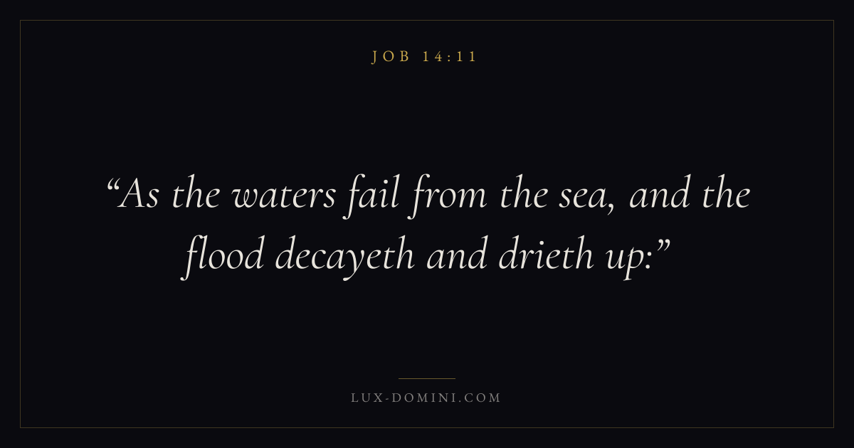 Books / Job / Chapter 14 / Verse 11 ← Job 14:10 Job 14:11 Job 14:12 → As the waters fail from the sea, and the flood decayeth and drieth up: Download verse card Share on Twitter Share on Facebook Pin it ✦ Key themes Suffering and trialsWisdomJustice and mercySuffering Read with Job 14:12Romans 8:182 Corinthians 4:17Proverbs 1:7 Related topics Bible verses about suffering and trialsBible verses about wisdomBible verses about justice and mercy ✦ Job Chapter 14 verses V. 1 V. 2 V. 3 V. 4 V. 5 V. 6 V. 7 V. 8 V. 9 V. 10 V. 11 V. 12 V. 13 V. 14 V. 15 V. 16 V. 17 V. 18 V. 19 V. 20 V. 21 V. 22