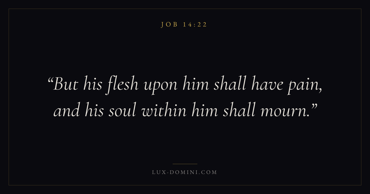 Books / Job / Chapter 14 / Verse 22 ← Job 14:21 Job 14:22 Job 15:1 → But his flesh upon him shall have pain, and his soul within him shall mourn. Download verse card Share on Twitter Share on Facebook Pin it ✦ Key themes FaithHopeSuffering and trialsWisdomSuffering Read with Job 14:21Hebrews 11:1Romans 10:17Romans 8:24 Related topics Bible verses about faithBible verses about hopeBible verses about suffering and trialsBible verses about wisdom ✦ Job Chapter 14 verses V. 1 V. 2 V. 3 V. 4 V. 5 V. 6 V. 7 V. 8 V. 9 V. 10 V. 11 V. 12 V. 13 V. 14 V. 15 V. 16 V. 17 V. 18 V. 19 V. 20 V. 21 V. 22