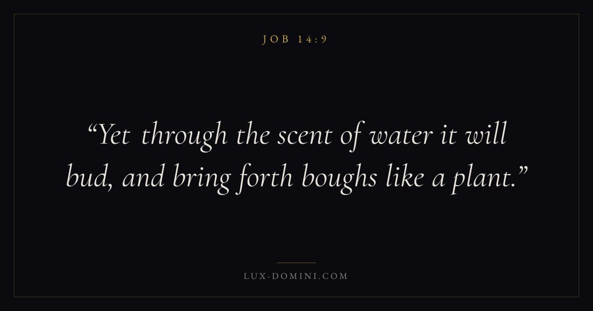 Books / Job / Chapter 14 / Verse 9 ← Job 14:8 Job 14:9 Job 14:10 → Yet through the scent of water it will bud, and bring forth boughs like a plant. Download verse card Share on Twitter Share on Facebook Pin it ✦ Key themes Suffering and trialsWisdomJustice and mercySuffering Read with Job 14:7Job 14:8Romans 8:182 Corinthians 4:17 Related topics Bible verses about suffering and trialsBible verses about wisdomBible verses about justice and mercy ✦ Job Chapter 14 verses V. 1 V. 2 V. 3 V. 4 V. 5 V. 6 V. 7 V. 8 V. 9 V. 10 V. 11 V. 12 V. 13 V. 14 V. 15 V. 16 V. 17 V. 18 V. 19 V. 20 V. 21 V. 22