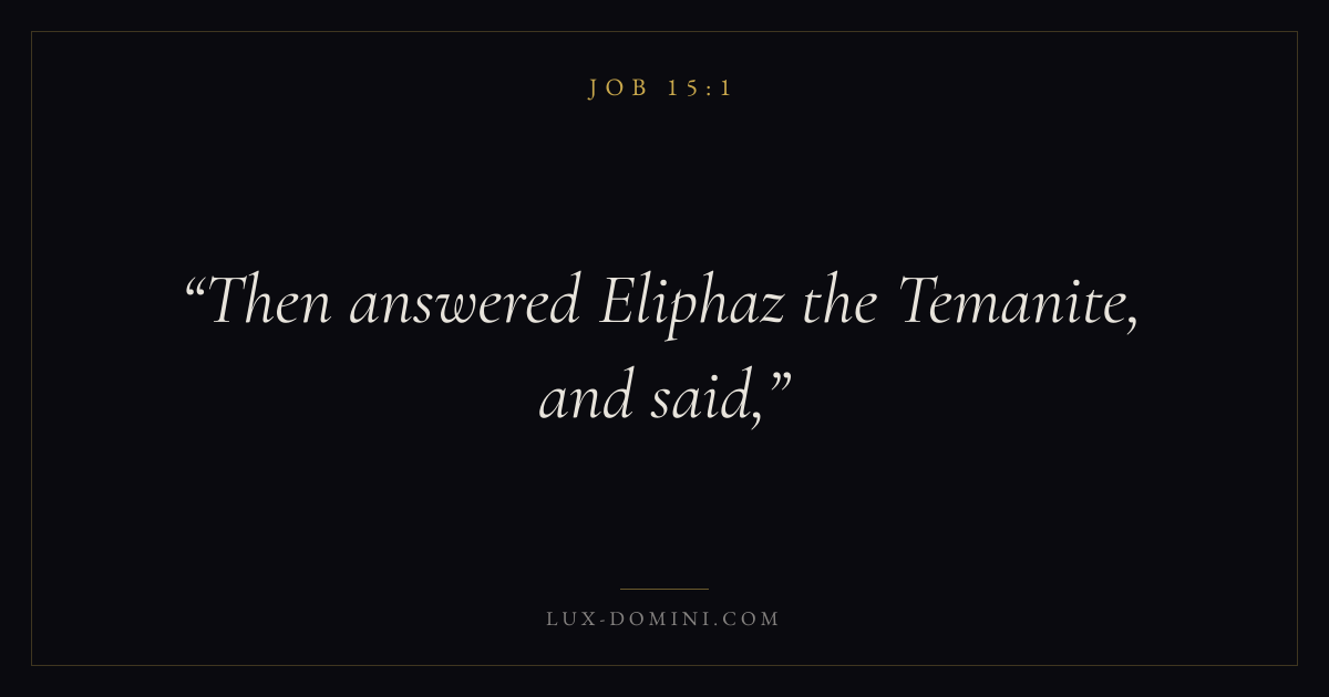 Books / Job / Chapter 15 / Verse 1 ← Job 14:22 Job 15:1 Job 15:2 → Then answered Eliphaz the Temanite, and said, Download verse card Share on Twitter Share on Facebook Pin it ✦ Key themes Anxiety and fearSuffering and trialsPrayerWisdomSuffering Read with Job 15:2Job 15:3Philippians 4:6Isaiah 41:10 Related topics Bible verses about anxiety and fearBible verses about suffering and trialsBible verses about prayerBible verses about wisdom ✦ Job Chapter 15 verses V. 1 V. 2 V. 3 V. 4 V. 5 V. 6 V. 7 V. 8 V. 9 V. 10 V. 11 V. 12 V. 13 V. 14 V. 15 V. 16 V. 17 V. 18 V. 19 V. 20 V. 21 V. 22 V. 23 V. 24 V. 25 V. 26 V. 27 V. 28 V. 29 V. 30 V. 31 V. 32 V. 33 V. 34 V. 35