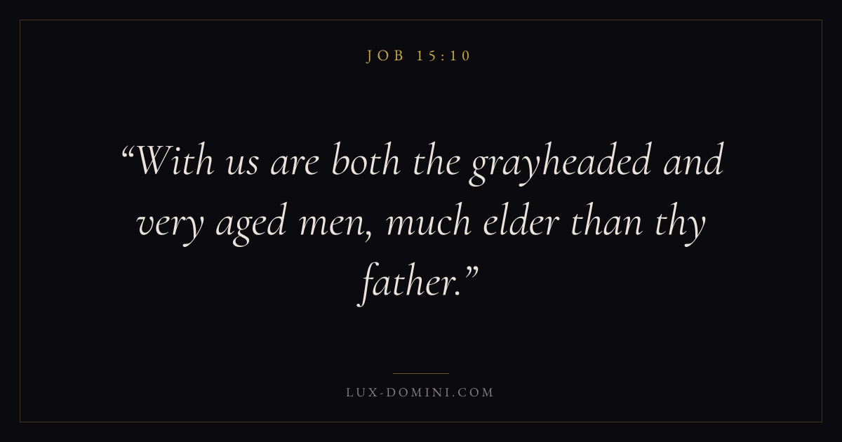 Books / Job / Chapter 15 / Verse 10 ← Job 15:9 Job 15:10 Job 15:11 → With us are both the grayheaded and very aged men, much elder than thy father. Download verse card Share on Twitter Share on Facebook Pin it ✦ Key themes Anxiety and fearSuffering and trialsPrayerWisdomSuffering Read with Job 15:11Philippians 4:6Isaiah 41:10Romans 8:18 Related topics Bible verses about anxiety and fearBible verses about suffering and trialsBible verses about prayerBible verses about wisdom ✦ Job Chapter 15 verses V. 1 V. 2 V. 3 V. 4 V. 5 V. 6 V. 7 V. 8 V. 9 V. 10 V. 11 V. 12 V. 13 V. 14 V. 15 V. 16 V. 17 V. 18 V. 19 V. 20 V. 21 V. 22 V. 23 V. 24 V. 25 V. 26 V. 27 V. 28 V. 29 V. 30 V. 31 V. 32 V. 33 V. 34 V. 35