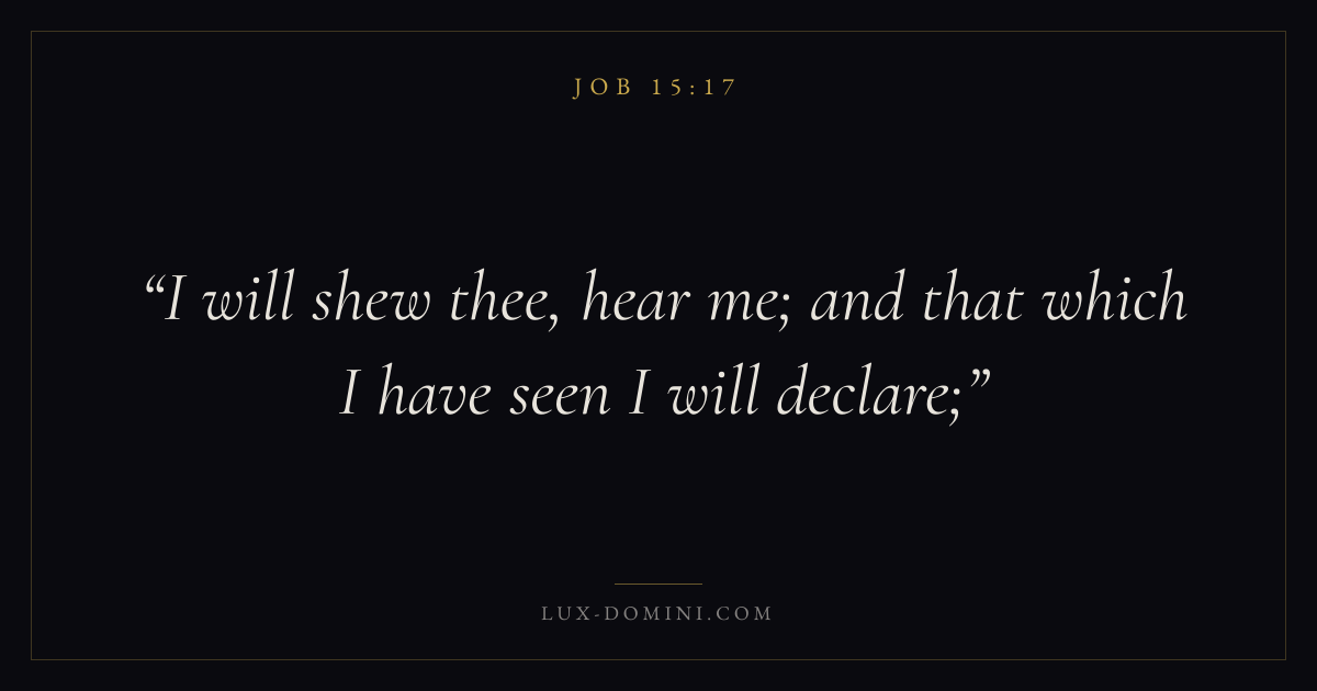 Books / Job / Chapter 15 / Verse 17 ← Job 15:16 Job 15:17 Job 15:18 → I will shew thee, hear me; and that which I have seen I will declare; Download verse card Share on Twitter Share on Facebook Pin it ✦ Key themes Suffering and trialsWisdomJustice and mercySuffering Read with Job 15:18Job 15:19Romans 8:182 Corinthians 4:17 Related topics Bible verses about suffering and trialsBible verses about wisdomBible verses about justice and mercy ✦ Job Chapter 15 verses V. 1 V. 2 V. 3 V. 4 V. 5 V. 6 V. 7 V. 8 V. 9 V. 10 V. 11 V. 12 V. 13 V. 14 V. 15 V. 16 V. 17 V. 18 V. 19 V. 20 V. 21 V. 22 V. 23 V. 24 V. 25 V. 26 V. 27 V. 28 V. 29 V. 30 V. 31 V. 32 V. 33 V. 34 V. 35