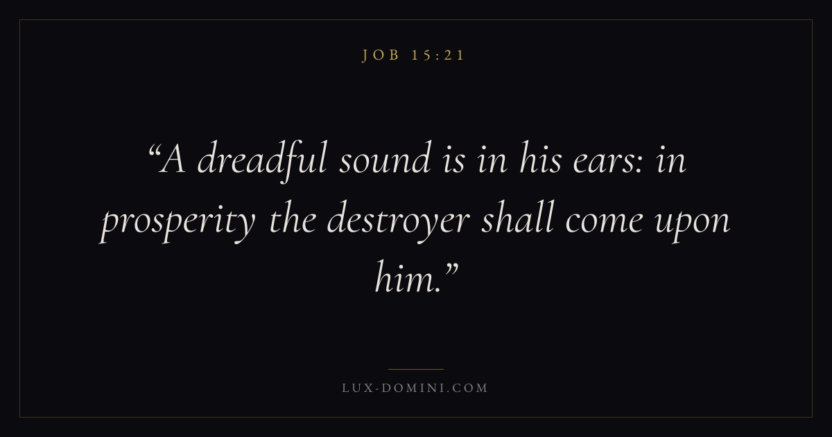 Books / Job / Chapter 15 / Verse 21 ← Job 15:20 Job 15:21 Job 15:22 → A dreadful sound is in his ears: in prosperity the destroyer shall come upon him. Download verse card Share on Twitter Share on Facebook Pin it ✦ Key themes Suffering and trialsWisdomJustice and mercySuffering Read with Job 15:20Romans 8:182 Corinthians 4:17Proverbs 1:7 Related topics Bible verses about suffering and trialsBible verses about wisdomBible verses about justice and mercy ✦ Job Chapter 15 verses V. 1 V. 2 V. 3 V. 4 V. 5 V. 6 V. 7 V. 8 V. 9 V. 10 V. 11 V. 12 V. 13 V. 14 V. 15 V. 16 V. 17 V. 18 V. 19 V. 20 V. 21 V. 22 V. 23 V. 24 V. 25 V. 26 V. 27 V. 28 V. 29 V. 30 V. 31 V. 32 V. 33 V. 34 V. 35