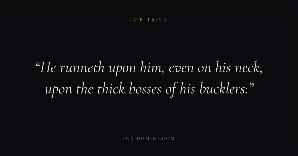 Books / Job / Chapter 15 / Verse 26 ← Job 15:25 Job 15:26 Job 15:27 → He runneth upon him, even on his neck, upon the thick bosses of his bucklers: Download verse card Share on Twitter Share on Facebook Pin it ✦ Key themes Suffering and trialsWisdomJustice and mercySuffering Read with Job 15:27Job 15:28Romans 8:182 Corinthians 4:17 Related topics Bible verses about suffering and trialsBible verses about wisdomBible verses about justice and mercy ✦ Job Chapter 15 verses V. 1 V. 2 V. 3 V. 4 V. 5 V. 6 V. 7 V. 8 V. 9 V. 10 V. 11 V. 12 V. 13 V. 14 V. 15 V. 16 V. 17 V. 18 V. 19 V. 20 V. 21 V. 22 V. 23 V. 24 V. 25 V. 26 V. 27 V. 28 V. 29 V. 30 V. 31 V. 32 V. 33 V. 34 V. 35
