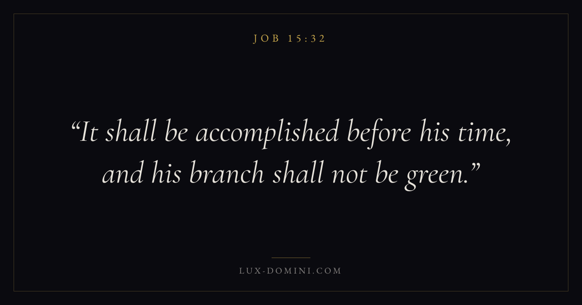 Books / Job / Chapter 15 / Verse 32 ← Job 15:31 Job 15:32 Job 15:33 → It shall be accomplished before his time, and his branch shall not be green. Download verse card Share on Twitter Share on Facebook Pin it ✦ Key themes Suffering and trialsWisdomJustice and mercySuffering Read with Job 15:31Romans 8:182 Corinthians 4:17Proverbs 1:7 Related topics Bible verses about suffering and trialsBible verses about wisdomBible verses about justice and mercy ✦ Job Chapter 15 verses V. 1 V. 2 V. 3 V. 4 V. 5 V. 6 V. 7 V. 8 V. 9 V. 10 V. 11 V. 12 V. 13 V. 14 V. 15 V. 16 V. 17 V. 18 V. 19 V. 20 V. 21 V. 22 V. 23 V. 24 V. 25 V. 26 V. 27 V. 28 V. 29 V. 30 V. 31 V. 32 V. 33 V. 34 V. 35