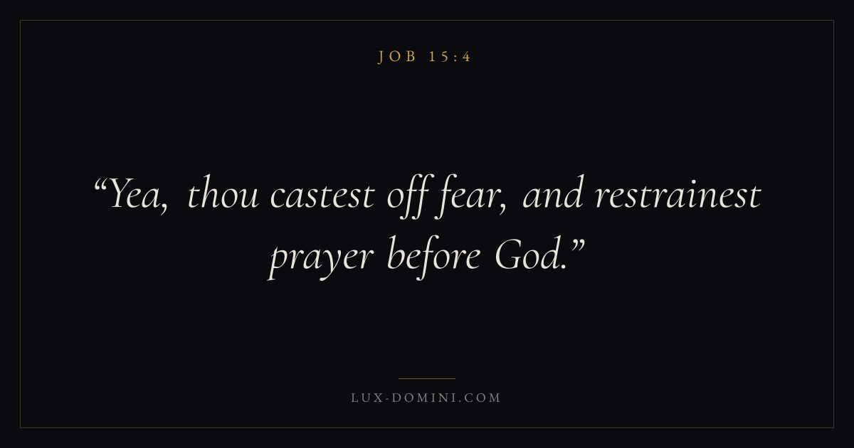 Books / Job / Chapter 15 / Verse 4 ← Job 15:3 Job 15:4 Job 15:5 → Yea, thou castest off fear, and restrainest prayer before God. Download verse card Share on Twitter Share on Facebook Pin it ✦ Key themes Anxiety and fearSuffering and trialsPrayerWisdomSuffering Read with Job 15:5Philippians 4:6Isaiah 41:10Romans 8:18 Related topics Bible verses about anxiety and fearBible verses about suffering and trialsBible verses about prayerBible verses about wisdom ✦ Job Chapter 15 verses V. 1 V. 2 V. 3 V. 4 V. 5 V. 6 V. 7 V. 8 V. 9 V. 10 V. 11 V. 12 V. 13 V. 14 V. 15 V. 16 V. 17 V. 18 V. 19 V. 20 V. 21 V. 22 V. 23 V. 24 V. 25 V. 26 V. 27 V. 28 V. 29 V. 30 V. 31 V. 32 V. 33 V. 34 V. 35