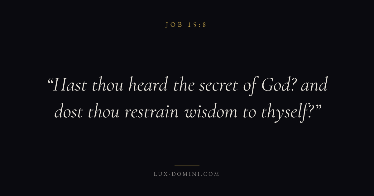 Books / Job / Chapter 15 / Verse 8 ← Job 15:7 Job 15:8 Job 15:9 → Hast thou heard the secret of God? and dost thou restrain wisdom to thyself? Download verse card Share on Twitter Share on Facebook Pin it ✦ Key themes Anxiety and fearSuffering and trialsPrayerWisdomSuffering Read with Job 15:9Philippians 4:6Isaiah 41:10Romans 8:18 Related topics Bible verses about anxiety and fearBible verses about suffering and trialsBible verses about prayerBible verses about wisdom ✦ Job Chapter 15 verses V. 1 V. 2 V. 3 V. 4 V. 5 V. 6 V. 7 V. 8 V. 9 V. 10 V. 11 V. 12 V. 13 V. 14 V. 15 V. 16 V. 17 V. 18 V. 19 V. 20 V. 21 V. 22 V. 23 V. 24 V. 25 V. 26 V. 27 V. 28 V. 29 V. 30 V. 31 V. 32 V. 33 V. 34 V. 35