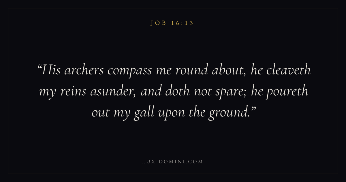 His archers compass me round about, he cleaveth my reins asunder, and doth not spare; he poureth out my gall upon the ground.