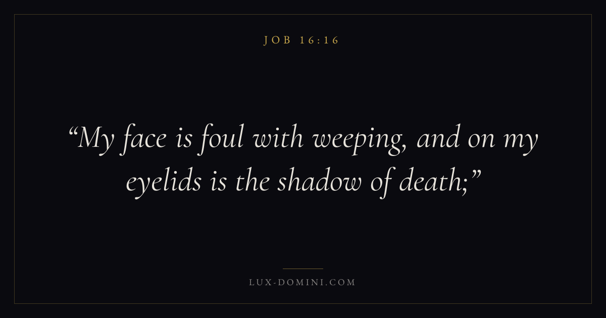 Books / Job / Chapter 16 / Verse 16 ← Job 16:15 Job 16:16 Job 16:17 → My face is foul with weeping, and on my eyelids is the shadow of death; Download verse card Share on Twitter Share on Facebook Pin it ✦ Key themes Suffering and trialsWisdomJustice and mercySuffering Read with Job 16:15Romans 8:182 Corinthians 4:17Proverbs 1:7 Related topics Bible verses about suffering and trialsBible verses about wisdomBible verses about justice and mercy ✦ Job Chapter 16 verses V. 1 V. 2 V. 3 V. 4 V. 5 V. 6 V. 7 V. 8 V. 9 V. 10 V. 11 V. 12 V. 13 V. 14 V. 15 V. 16 V. 17 V. 18 V. 19 V. 20 V. 21 V. 22