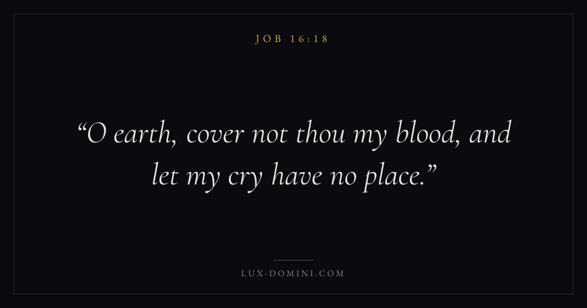 Books / Job / Chapter 16 / Verse 18 ← Job 16:17 Job 16:18 Job 16:19 → O earth, cover not thou my blood, and let my cry have no place. Download verse card Share on Twitter Share on Facebook Pin it ✦ Key themes Suffering and trialsWisdomJustice and mercyTruthSuffering Read with Job 16:17Romans 8:182 Corinthians 4:17Proverbs 1:7 Related topics Bible verses about suffering and trialsBible verses about wisdomBible verses about justice and mercyBible verses about truth ✦ Job Chapter 16 verses V. 1 V. 2 V. 3 V. 4 V. 5 V. 6 V. 7 V. 8 V. 9 V. 10 V. 11 V. 12 V. 13 V. 14 V. 15 V. 16 V. 17 V. 18 V. 19 V. 20 V. 21 V. 22