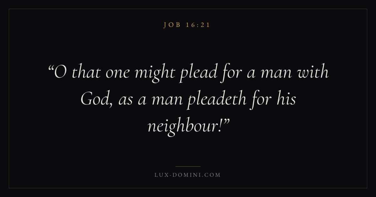 Books / Job / Chapter 16 / Verse 21 ← Job 16:20 Job 16:21 Job 16:22 → O that one might plead for a man with God, as a man pleadeth for his neighbour! Download verse card Share on Twitter Share on Facebook Pin it ✦ Key themes Suffering and trialsWisdomJustice and mercyTruthSuffering Read with Job 16:22Romans 8:182 Corinthians 4:17Proverbs 1:7 Related topics Bible verses about suffering and trialsBible verses about wisdomBible verses about justice and mercyBible verses about truth ✦ Job Chapter 16 verses V. 1 V. 2 V. 3 V. 4 V. 5 V. 6 V. 7 V. 8 V. 9 V. 10 V. 11 V. 12 V. 13 V. 14 V. 15 V. 16 V. 17 V. 18 V. 19 V. 20 V. 21 V. 22