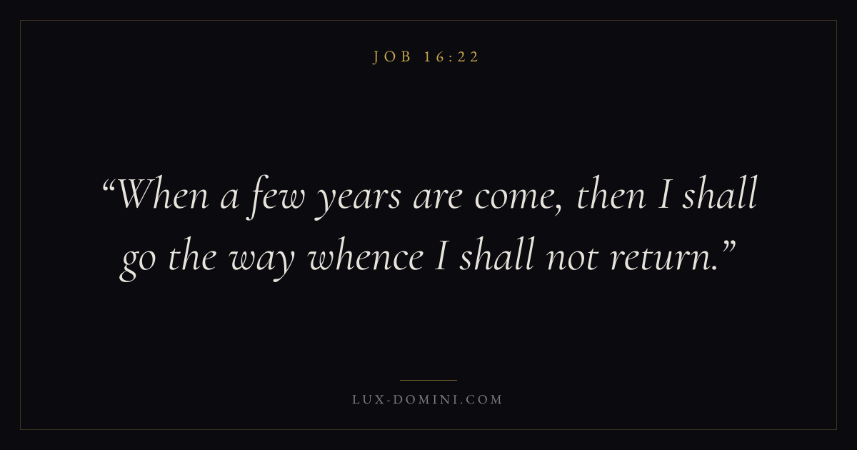 Books / Job / Chapter 16 / Verse 22 ← Job 16:21 Job 16:22 Job 17:1 → When a few years are come, then I shall go the way whence I shall not return. Download verse card Share on Twitter Share on Facebook Pin it ✦ Key themes Suffering and trialsWisdomJustice and mercyTruthSuffering Read with Job 16:21Romans 8:182 Corinthians 4:17Proverbs 1:7 Related topics Bible verses about suffering and trialsBible verses about wisdomBible verses about justice and mercyBible verses about truth ✦ Job Chapter 16 verses V. 1 V. 2 V. 3 V. 4 V. 5 V. 6 V. 7 V. 8 V. 9 V. 10 V. 11 V. 12 V. 13 V. 14 V. 15 V. 16 V. 17 V. 18 V. 19 V. 20 V. 21 V. 22