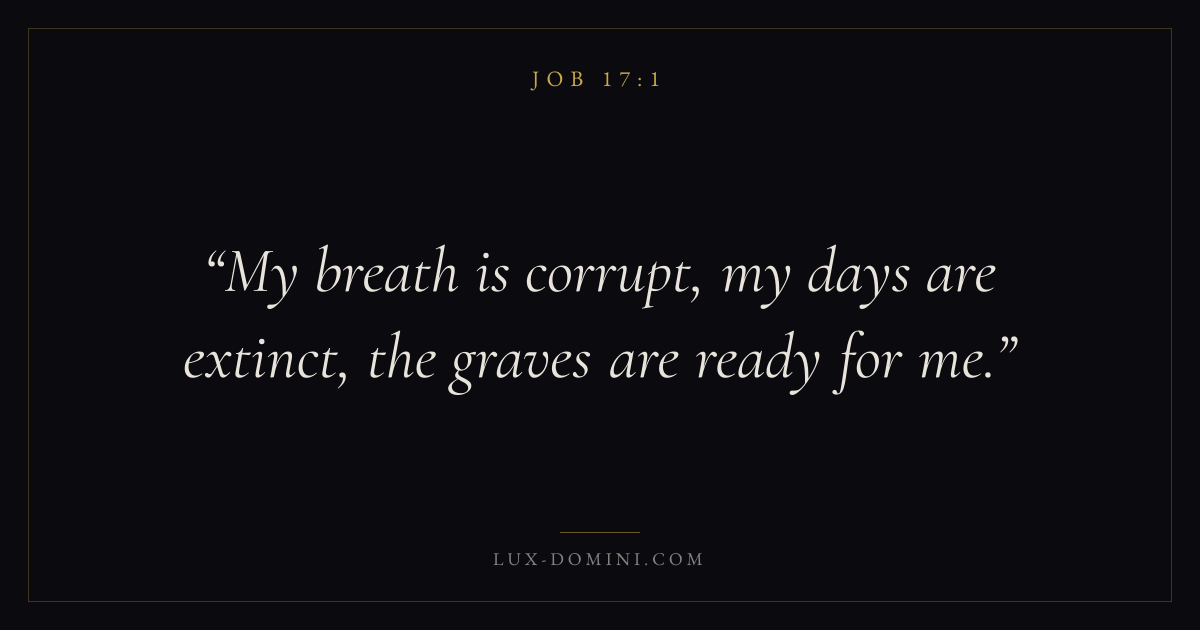 Books / Job / Chapter 17 / Verse 1 ← Job 16:22 Job 17:1 Job 17:2 → My breath is corrupt, my days are extinct, the graves are ready for me. Download verse card Share on Twitter Share on Facebook Pin it ✦ Key themes Suffering and trialsWisdomJustice and mercySuffering Read with Job 17:2Romans 8:182 Corinthians 4:17Proverbs 1:7 Related topics Bible verses about suffering and trialsBible verses about wisdomBible verses about justice and mercy ✦ Job Chapter 17 verses V. 1 V. 2 V. 3 V. 4 V. 5 V. 6 V. 7 V. 8 V. 9 V. 10 V. 11 V. 12 V. 13 V. 14 V. 15 V. 16
