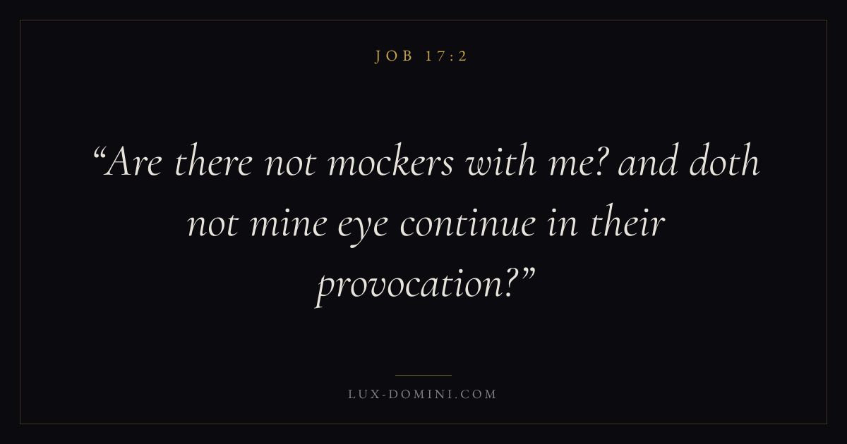 Books / Job / Chapter 17 / Verse 2 ← Job 17:1 Job 17:2 Job 17:3 → Are there not mockers with me? and doth not mine eye continue in their provocation? Download verse card Share on Twitter Share on Facebook Pin it ✦ Key themes Suffering and trialsWisdomJustice and mercySuffering Read with Job 17:1Romans 8:182 Corinthians 4:17Proverbs 1:7 Related topics Bible verses about suffering and trialsBible verses about wisdomBible verses about justice and mercy ✦ Job Chapter 17 verses V. 1 V. 2 V. 3 V. 4 V. 5 V. 6 V. 7 V. 8 V. 9 V. 10 V. 11 V. 12 V. 13 V. 14 V. 15 V. 16