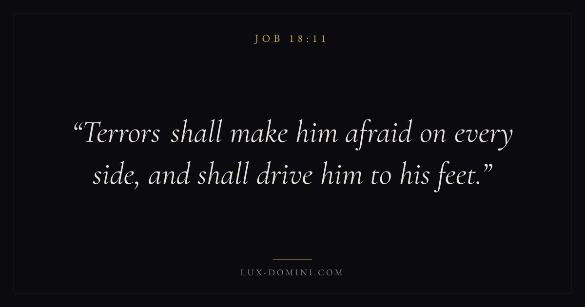Books / Job / Chapter 18 / Verse 11 ← Job 18:10 Job 18:11 Job 18:12 → Terrors shall make him afraid on every side, and shall drive him to his feet. Download verse card Share on Twitter Share on Facebook Pin it ✦ Key themes Anxiety and fearSuffering and trialsWisdomJustice and mercySuffering Read with Job 18:12Philippians 4:6Isaiah 41:10Romans 8:18 Related topics Bible verses about anxiety and fearBible verses about suffering and trialsBible verses about wisdomBible verses about justice and mercy ✦ Job Chapter 18 verses V. 1 V. 2 V. 3 V. 4 V. 5 V. 6 V. 7 V. 8 V. 9 V. 10 V. 11 V. 12 V. 13 V. 14 V. 15 V. 16 V. 17 V. 18 V. 19 V. 20 V. 21