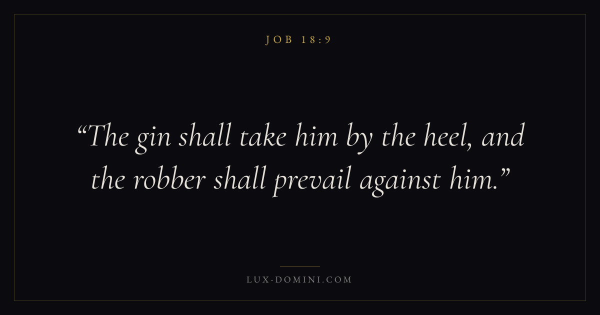 Books / Job / Chapter 18 / Verse 9 ← Job 18:8 Job 18:9 Job 18:10 → The gin shall take him by the heel, and the robber shall prevail against him. Download verse card Share on Twitter Share on Facebook Pin it ✦ Key themes Suffering and trialsWisdomJustice and mercyTruthSuffering Read with Job 18:10Romans 8:182 Corinthians 4:17Proverbs 1:7 Related topics Bible verses about suffering and trialsBible verses about wisdomBible verses about justice and mercyBible verses about truth ✦ Job Chapter 18 verses V. 1 V. 2 V. 3 V. 4 V. 5 V. 6 V. 7 V. 8 V. 9 V. 10 V. 11 V. 12 V. 13 V. 14 V. 15 V. 16 V. 17 V. 18 V. 19 V. 20 V. 21