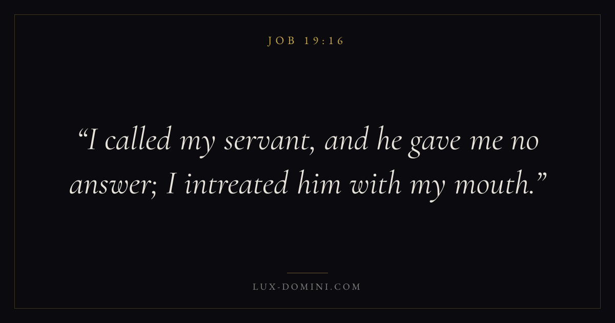 Books / Job / Chapter 19 / Verse 16 ← Job 19:15 Job 19:16 Job 19:17 → I called my servant, and he gave me no answer; I intreated him with my mouth. Download verse card Share on Twitter Share on Facebook Pin it ✦ Key themes Suffering and trialsWisdomJustice and mercySuffering Read with Job 19:17Romans 8:182 Corinthians 4:17Proverbs 1:7 Related topics Bible verses about suffering and trialsBible verses about wisdomBible verses about justice and mercy ✦ Job Chapter 19 verses V. 1 V. 2 V. 3 V. 4 V. 5 V. 6 V. 7 V. 8 V. 9 V. 10 V. 11 V. 12 V. 13 V. 14 V. 15 V. 16 V. 17 V. 18 V. 19 V. 20 V. 21 V. 22 V. 23 V. 24 V. 25 V. 26 V. 27 V. 28 V. 29