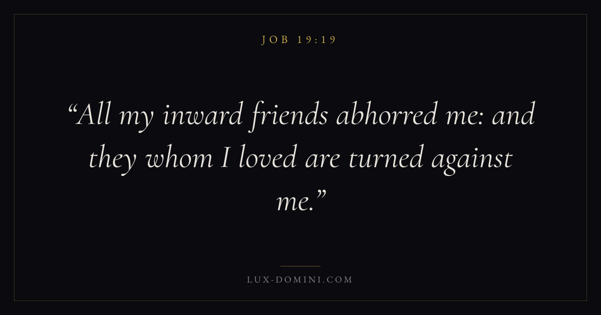 Books / Job / Chapter 19 / Verse 19 ← Job 19:18 Job 19:19 Job 19:20 → All my inward friends abhorred me: and they whom I loved are turned against me. Download verse card Share on Twitter Share on Facebook Pin it ✦ Key themes Suffering and trialsWisdomJustice and mercySuffering Read with Job 19:18Romans 8:182 Corinthians 4:17Proverbs 1:7 Related topics Bible verses about suffering and trialsBible verses about wisdomBible verses about justice and mercy ✦ Job Chapter 19 verses V. 1 V. 2 V. 3 V. 4 V. 5 V. 6 V. 7 V. 8 V. 9 V. 10 V. 11 V. 12 V. 13 V. 14 V. 15 V. 16 V. 17 V. 18 V. 19 V. 20 V. 21 V. 22 V. 23 V. 24 V. 25 V. 26 V. 27 V. 28 V. 29
