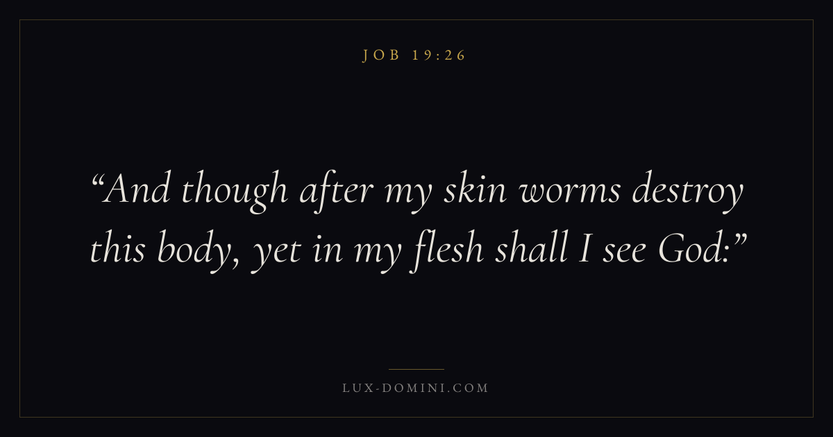 Books / Job / Chapter 19 / Verse 26 ← Job 19:25 Job 19:26 Job 19:27 → And though after my skin worms destroy this body, yet in my flesh shall I see God: Download verse card Share on Twitter Share on Facebook Pin it ✦ Key themes FaithHopeSuffering and trialsWisdomSuffering Read with Job 19:24Job 19:25Hebrews 11:1Romans 10:17 Related topics Bible verses about faithBible verses about hopeBible verses about suffering and trialsBible verses about wisdom ✦ Job Chapter 19 verses V. 1 V. 2 V. 3 V. 4 V. 5 V. 6 V. 7 V. 8 V. 9 V. 10 V. 11 V. 12 V. 13 V. 14 V. 15 V. 16 V. 17 V. 18 V. 19 V. 20 V. 21 V. 22 V. 23 V. 24 V. 25 V. 26 V. 27 V. 28 V. 29