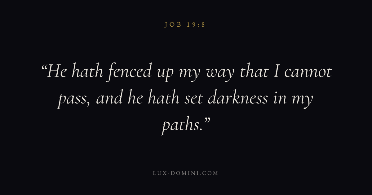 Books / Job / Chapter 19 / Verse 8 ← Job 19:7 Job 19:8 Job 19:9 → He hath fenced up my way that I cannot pass, and he hath set darkness in my paths. Download verse card Share on Twitter Share on Facebook Pin it ✦ Key themes Suffering and trialsWisdomJustice and mercySuffering Read with Job 19:9Romans 8:182 Corinthians 4:17Proverbs 1:7 Related topics Bible verses about suffering and trialsBible verses about wisdomBible verses about justice and mercy ✦ Job Chapter 19 verses V. 1 V. 2 V. 3 V. 4 V. 5 V. 6 V. 7 V. 8 V. 9 V. 10 V. 11 V. 12 V. 13 V. 14 V. 15 V. 16 V. 17 V. 18 V. 19 V. 20 V. 21 V. 22 V. 23 V. 24 V. 25 V. 26 V. 27 V. 28 V. 29
