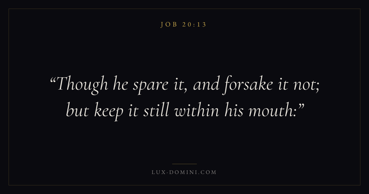Books / Job / Chapter 20 / Verse 13 ← Job 20:12 Job 20:13 Job 20:14 → Though he spare it, and forsake it not; but keep it still within his mouth: Download verse card Share on Twitter Share on Facebook Pin it ✦ Key themes Suffering and trialsWisdomJustice and mercyPeaceSuffering Read with Job 20:12Job 20:14Romans 8:182 Corinthians 4:17 Related topics Bible verses about suffering and trialsBible verses about wisdomBible verses about justice and mercyBible verses about peace ✦ Job Chapter 20 verses V. 1 V. 2 V. 3 V. 4 V. 5 V. 6 V. 7 V. 8 V. 9 V. 10 V. 11 V. 12 V. 13 V. 14 V. 15 V. 16 V. 17 V. 18 V. 19 V. 20 V. 21 V. 22 V. 23 V. 24 V. 25 V. 26 V. 27 V. 28 V. 29
