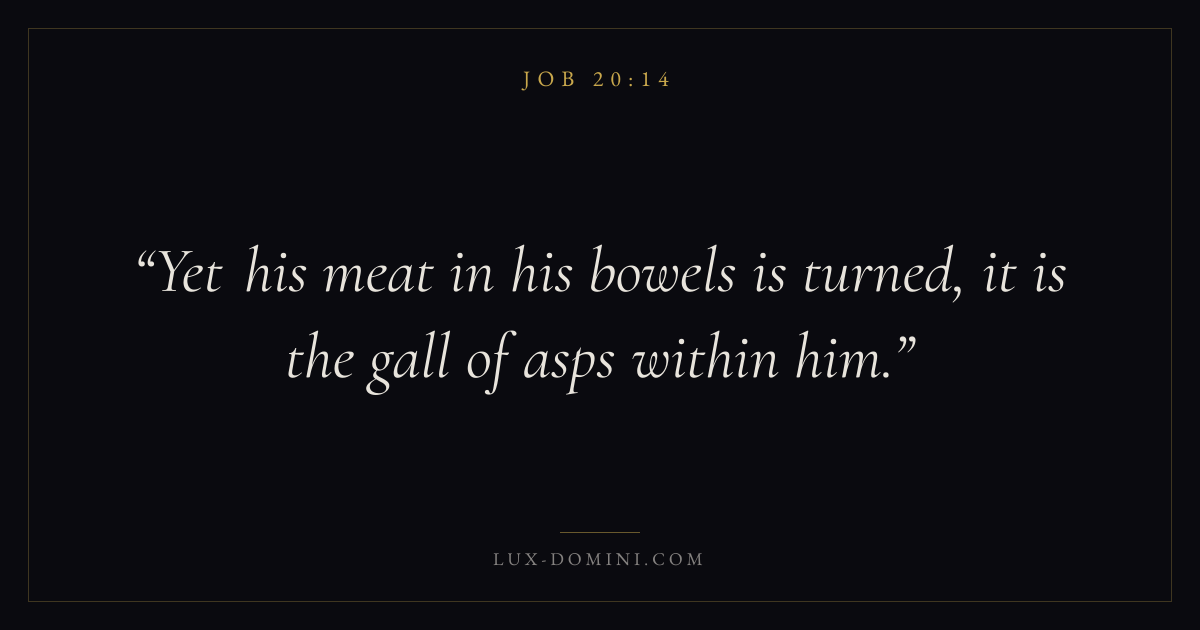 Books / Job / Chapter 20 / Verse 14 ← Job 20:13 Job 20:14 Job 20:15 → Yet his meat in his bowels is turned, it is the gall of asps within him. Download verse card Share on Twitter Share on Facebook Pin it ✦ Key themes Suffering and trialsWisdomJustice and mercySuffering Read with Job 20:12Job 20:13Romans 8:182 Corinthians 4:17 Related topics Bible verses about suffering and trialsBible verses about wisdomBible verses about justice and mercy ✦ Job Chapter 20 verses V. 1 V. 2 V. 3 V. 4 V. 5 V. 6 V. 7 V. 8 V. 9 V. 10 V. 11 V. 12 V. 13 V. 14 V. 15 V. 16 V. 17 V. 18 V. 19 V. 20 V. 21 V. 22 V. 23 V. 24 V. 25 V. 26 V. 27 V. 28 V. 29