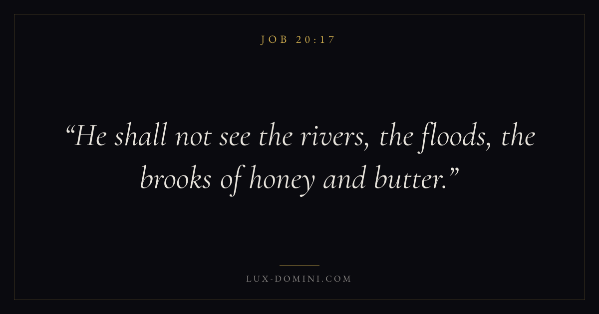 Books / Job / Chapter 20 / Verse 17 ← Job 20:16 Job 20:17 Job 20:18 → He shall not see the rivers, the floods, the brooks of honey and butter. Download verse card Share on Twitter Share on Facebook Pin it ✦ Key themes Suffering and trialsWisdomJustice and mercySuffering Read with Job 20:18Romans 8:182 Corinthians 4:17Proverbs 1:7 Related topics Bible verses about suffering and trialsBible verses about wisdomBible verses about justice and mercy ✦ Job Chapter 20 verses V. 1 V. 2 V. 3 V. 4 V. 5 V. 6 V. 7 V. 8 V. 9 V. 10 V. 11 V. 12 V. 13 V. 14 V. 15 V. 16 V. 17 V. 18 V. 19 V. 20 V. 21 V. 22 V. 23 V. 24 V. 25 V. 26 V. 27 V. 28 V. 29