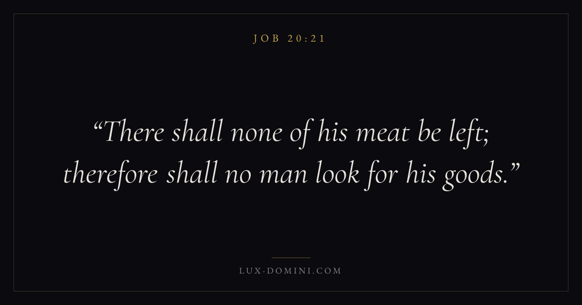 Books / Job / Chapter 20 / Verse 21 ← Job 20:20 Job 20:21 Job 20:22 → There shall none of his meat be left; therefore shall no man look for his goods. Download verse card Share on Twitter Share on Facebook Pin it ✦ Key themes Suffering and trialsWisdomJustice and mercySuffering Read with Job 20:22Romans 8:182 Corinthians 4:17Proverbs 1:7 Related topics Bible verses about suffering and trialsBible verses about wisdomBible verses about justice and mercy ✦ Job Chapter 20 verses V. 1 V. 2 V. 3 V. 4 V. 5 V. 6 V. 7 V. 8 V. 9 V. 10 V. 11 V. 12 V. 13 V. 14 V. 15 V. 16 V. 17 V. 18 V. 19 V. 20 V. 21 V. 22 V. 23 V. 24 V. 25 V. 26 V. 27 V. 28 V. 29