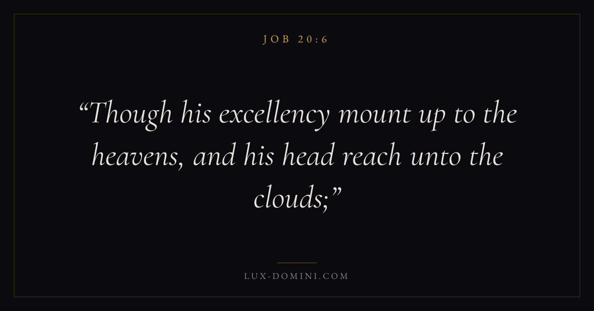 Books / Job / Chapter 20 / Verse 6 ← Job 20:5 Job 20:6 Job 20:7 → Though his excellency mount up to the heavens, and his head reach unto the clouds; Download verse card Share on Twitter Share on Facebook Pin it ✦ Key themes Suffering and trialsWisdomJustice and mercySuffering Read with Job 20:7Romans 8:182 Corinthians 4:17Proverbs 1:7 Related topics Bible verses about suffering and trialsBible verses about wisdomBible verses about justice and mercy ✦ Job Chapter 20 verses V. 1 V. 2 V. 3 V. 4 V. 5 V. 6 V. 7 V. 8 V. 9 V. 10 V. 11 V. 12 V. 13 V. 14 V. 15 V. 16 V. 17 V. 18 V. 19 V. 20 V. 21 V. 22 V. 23 V. 24 V. 25 V. 26 V. 27 V. 28 V. 29