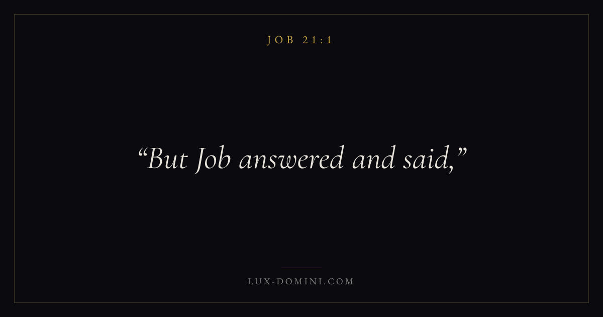 Books / Job / Chapter 21 / Verse 1 ← Job 20:29 Job 21:1 Job 21:2 → But Job answered and said, Download verse card Share on Twitter Share on Facebook Pin it ✦ Key themes Suffering and trialsWisdomJustice and mercyTruthSuffering Read with Job 21:2Romans 8:182 Corinthians 4:17Proverbs 1:7 Related topics Bible verses about suffering and trialsBible verses about wisdomBible verses about justice and mercyBible verses about truth ✦ Job Chapter 21 verses V. 1 V. 2 V. 3 V. 4 V. 5 V. 6 V. 7 V. 8 V. 9 V. 10 V. 11 V. 12 V. 13 V. 14 V. 15 V. 16 V. 17 V. 18 V. 19 V. 20 V. 21 V. 22 V. 23 V. 24 V. 25 V. 26 V. 27 V. 28 V. 29 V. 30 V. 31 V. 32 V. 33 V. 34