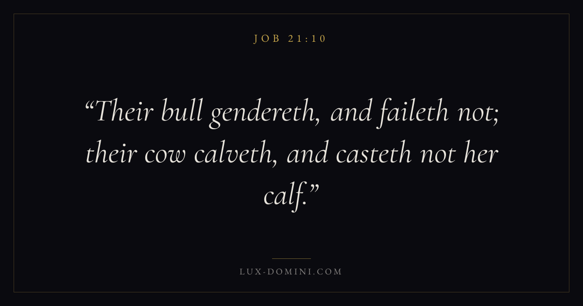 Books / Job / Chapter 21 / Verse 10 ← Job 21:9 Job 21:10 Job 21:11 → Their bull gendereth, and faileth not; their cow calveth, and casteth not her calf. Download verse card Share on Twitter Share on Facebook Pin it ✦ Key themes Suffering and trialsWisdomJustice and mercySuffering Read with Job 21:9Romans 8:182 Corinthians 4:17Proverbs 1:7 Related topics Bible verses about suffering and trialsBible verses about wisdomBible verses about justice and mercy ✦ Job Chapter 21 verses V. 1 V. 2 V. 3 V. 4 V. 5 V. 6 V. 7 V. 8 V. 9 V. 10 V. 11 V. 12 V. 13 V. 14 V. 15 V. 16 V. 17 V. 18 V. 19 V. 20 V. 21 V. 22 V. 23 V. 24 V. 25 V. 26 V. 27 V. 28 V. 29 V. 30 V. 31 V. 32 V. 33 V. 34