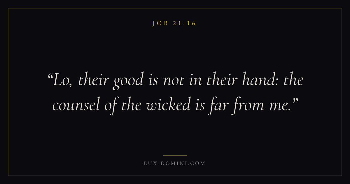 Books / Job / Chapter 21 / Verse 16 ← Job 21:15 Job 21:16 Job 21:17 → Lo, their good is not in their hand: the counsel of the wicked is far from me. Download verse card Share on Twitter Share on Facebook Pin it ✦ Key themes Suffering and trialsWisdomJustice and mercySuffering Read with Job 21:15Romans 8:182 Corinthians 4:17Proverbs 1:7 Related topics Bible verses about suffering and trialsBible verses about wisdomBible verses about justice and mercy ✦ Job Chapter 21 verses V. 1 V. 2 V. 3 V. 4 V. 5 V. 6 V. 7 V. 8 V. 9 V. 10 V. 11 V. 12 V. 13 V. 14 V. 15 V. 16 V. 17 V. 18 V. 19 V. 20 V. 21 V. 22 V. 23 V. 24 V. 25 V. 26 V. 27 V. 28 V. 29 V. 30 V. 31 V. 32 V. 33 V. 34
