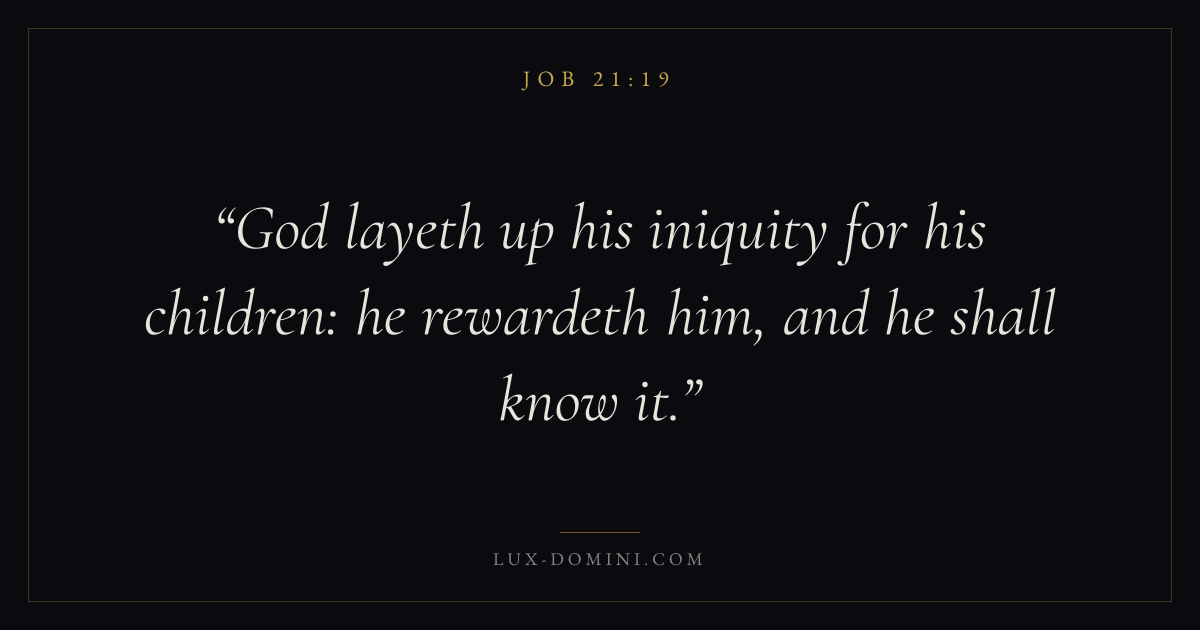 Books / Job / Chapter 21 / Verse 19 ← Job 21:18 Job 21:19 Job 21:20 → God layeth up his iniquity for his children: he rewardeth him, and he shall know it. Download verse card Share on Twitter Share on Facebook Pin it ✦ Key themes Suffering and trialsWisdomJustice and mercySuffering Read with Job 21:17Job 21:18Romans 8:182 Corinthians 4:17 Related topics Bible verses about suffering and trialsBible verses about wisdomBible verses about justice and mercy ✦ Job Chapter 21 verses V. 1 V. 2 V. 3 V. 4 V. 5 V. 6 V. 7 V. 8 V. 9 V. 10 V. 11 V. 12 V. 13 V. 14 V. 15 V. 16 V. 17 V. 18 V. 19 V. 20 V. 21 V. 22 V. 23 V. 24 V. 25 V. 26 V. 27 V. 28 V. 29 V. 30 V. 31 V. 32 V. 33 V. 34