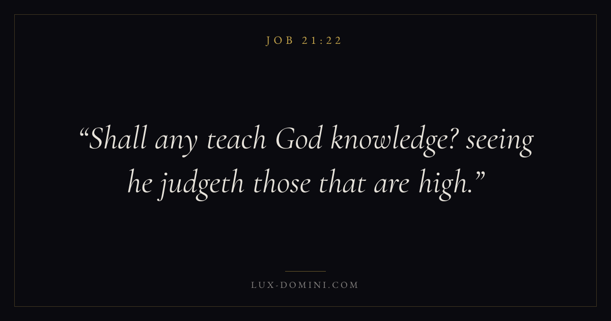 Books / Job / Chapter 21 / Verse 22 ← Job 21:21 Job 21:22 Job 21:23 → Shall any teach God knowledge? seeing he judgeth those that are high. Download verse card Share on Twitter Share on Facebook Pin it ✦ Key themes Suffering and trialsWisdomJustice and mercySuffering Read with Job 21:23Romans 8:182 Corinthians 4:17Proverbs 1:7 Related topics Bible verses about suffering and trialsBible verses about wisdomBible verses about justice and mercy ✦ Job Chapter 21 verses V. 1 V. 2 V. 3 V. 4 V. 5 V. 6 V. 7 V. 8 V. 9 V. 10 V. 11 V. 12 V. 13 V. 14 V. 15 V. 16 V. 17 V. 18 V. 19 V. 20 V. 21 V. 22 V. 23 V. 24 V. 25 V. 26 V. 27 V. 28 V. 29 V. 30 V. 31 V. 32 V. 33 V. 34
