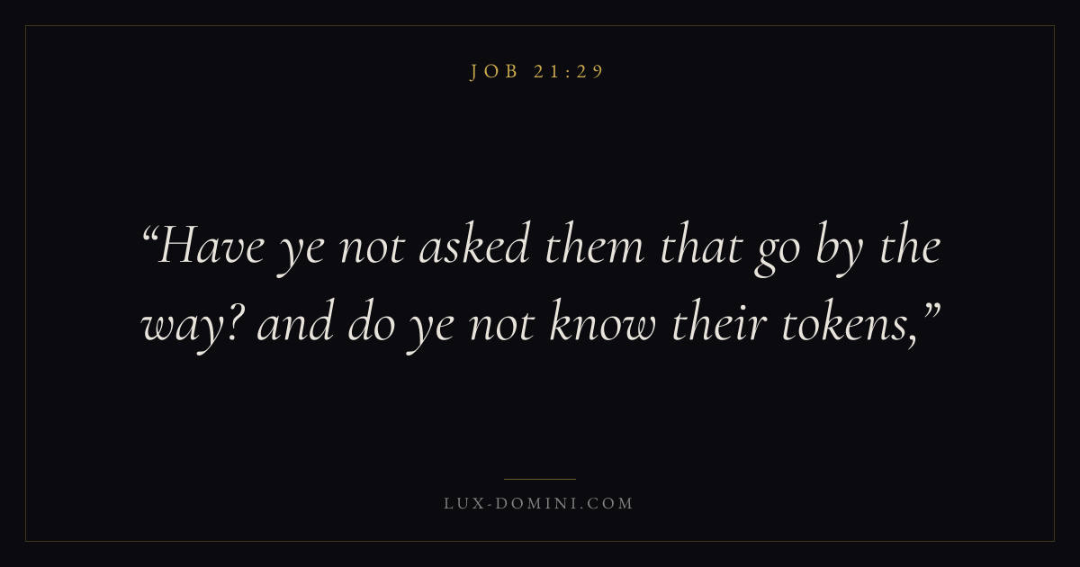 Books / Job / Chapter 21 / Verse 29 ← Job 21:28 Job 21:29 Job 21:30 → Have ye not asked them that go by the way? and do ye not know their tokens, Download verse card Share on Twitter Share on Facebook Pin it ✦ Key themes Suffering and trialsPrayerWisdomJustice and mercySuffering Read with Job 21:30Romans 8:182 Corinthians 4:17Matthew 6:9 Related topics Bible verses about suffering and trialsBible verses about prayerBible verses about wisdomBible verses about justice and mercy ✦ Job Chapter 21 verses V. 1 V. 2 V. 3 V. 4 V. 5 V. 6 V. 7 V. 8 V. 9 V. 10 V. 11 V. 12 V. 13 V. 14 V. 15 V. 16 V. 17 V. 18 V. 19 V. 20 V. 21 V. 22 V. 23 V. 24 V. 25 V. 26 V. 27 V. 28 V. 29 V. 30 V. 31 V. 32 V. 33 V. 34