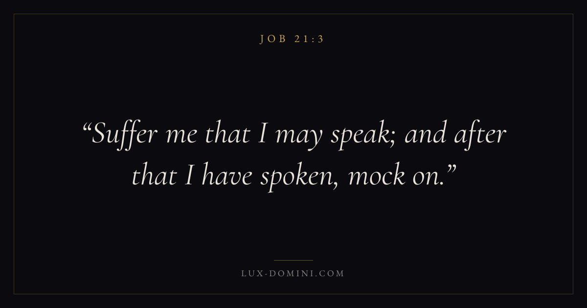 Books / Job / Chapter 21 / Verse 3 ← Job 21:2 Job 21:3 Job 21:4 → Suffer me that I may speak; and after that I have spoken, mock on. Download verse card Share on Twitter Share on Facebook Pin it ✦ Key themes Suffering and trialsWisdomJustice and mercyTruthSuffering Read with Job 21:4Romans 8:182 Corinthians 4:17Proverbs 1:7 Related topics Bible verses about suffering and trialsBible verses about wisdomBible verses about justice and mercyBible verses about truth ✦ Job Chapter 21 verses V. 1 V. 2 V. 3 V. 4 V. 5 V. 6 V. 7 V. 8 V. 9 V. 10 V. 11 V. 12 V. 13 V. 14 V. 15 V. 16 V. 17 V. 18 V. 19 V. 20 V. 21 V. 22 V. 23 V. 24 V. 25 V. 26 V. 27 V. 28 V. 29 V. 30 V. 31 V. 32 V. 33 V. 34
