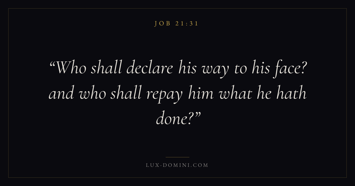 Books / Job / Chapter 21 / Verse 31 ← Job 21:30 Job 21:31 Job 21:32 → Who shall declare his way to his face? and who shall repay him what he hath done? Download verse card Share on Twitter Share on Facebook Pin it ✦ Key themes Suffering and trialsWisdomJustice and mercySuffering Read with Job 21:32Romans 8:182 Corinthians 4:17Proverbs 1:7 Related topics Bible verses about suffering and trialsBible verses about wisdomBible verses about justice and mercy ✦ Job Chapter 21 verses V. 1 V. 2 V. 3 V. 4 V. 5 V. 6 V. 7 V. 8 V. 9 V. 10 V. 11 V. 12 V. 13 V. 14 V. 15 V. 16 V. 17 V. 18 V. 19 V. 20 V. 21 V. 22 V. 23 V. 24 V. 25 V. 26 V. 27 V. 28 V. 29 V. 30 V. 31 V. 32 V. 33 V. 34