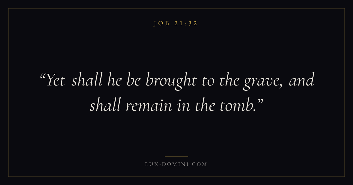 Books / Job / Chapter 21 / Verse 32 ← Job 21:31 Job 21:32 Job 21:33 → Yet shall he be brought to the grave, and shall remain in the tomb. Download verse card Share on Twitter Share on Facebook Pin it ✦ Key themes Suffering and trialsWisdomJustice and mercySuffering Read with Job 21:31Romans 8:182 Corinthians 4:17Proverbs 1:7 Related topics Bible verses about suffering and trialsBible verses about wisdomBible verses about justice and mercy ✦ Job Chapter 21 verses V. 1 V. 2 V. 3 V. 4 V. 5 V. 6 V. 7 V. 8 V. 9 V. 10 V. 11 V. 12 V. 13 V. 14 V. 15 V. 16 V. 17 V. 18 V. 19 V. 20 V. 21 V. 22 V. 23 V. 24 V. 25 V. 26 V. 27 V. 28 V. 29 V. 30 V. 31 V. 32 V. 33 V. 34